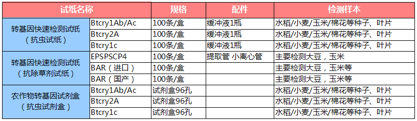 其他相關產品:轉基因 Bt Cry1Ab/1Ac 快速檢測試紙、轉基因 Bt Cry1C 快速檢測試紙、轉基因 Bt Cry2A 快速檢測試紙、轉基因 Cry1Ab/1Ac 試劑盒、轉基因 Cry1C 試劑盒、轉基因 Cry2A 試劑盒